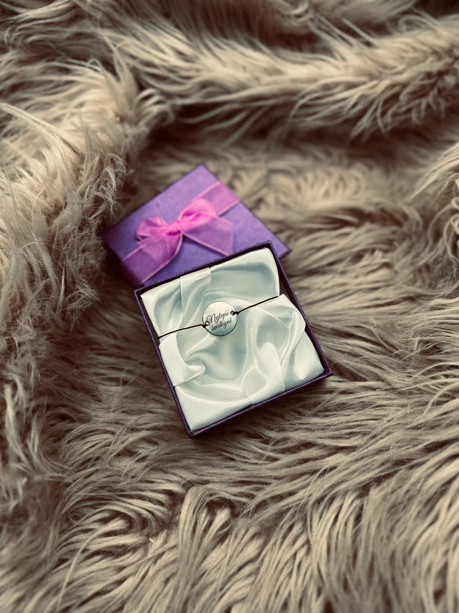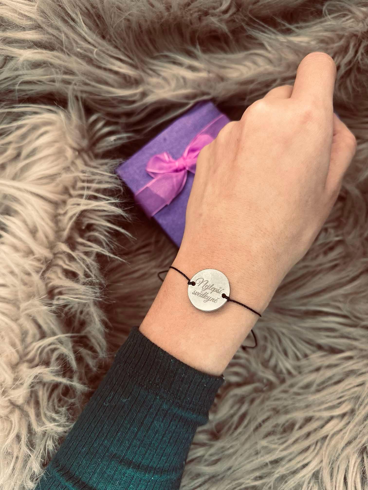 Náramek v kombinaci chirurgická ocel a černá šňůrka. Lze vypsat krátký text (Svědkyni, datum svatby, mamince, nejlepší mamince, babičce, pro štěstí...... je zcela na Vás). Nebo lze dát fotku Vás, zvířat nebo loga. Prosím vepsat do poznámky.