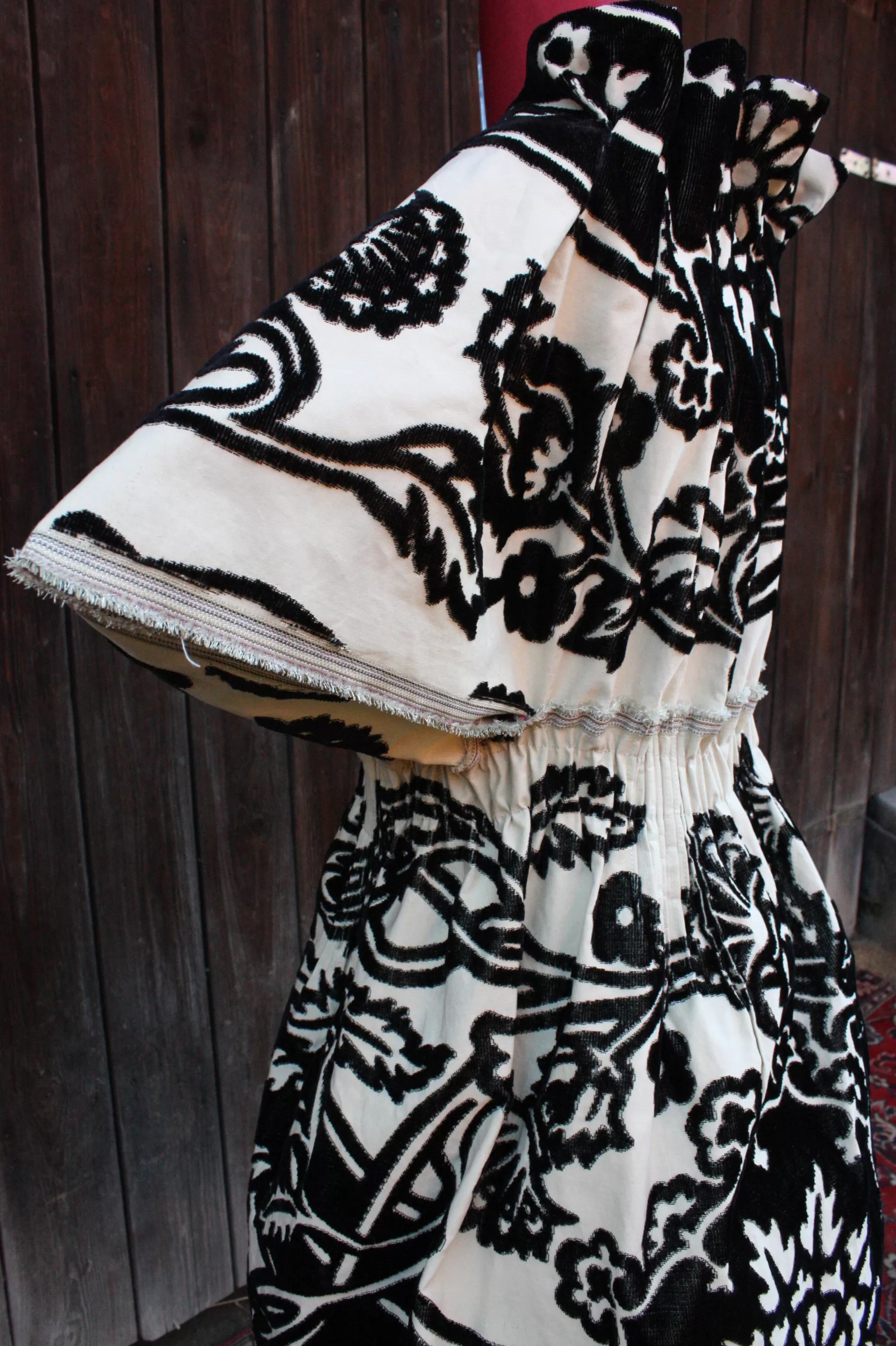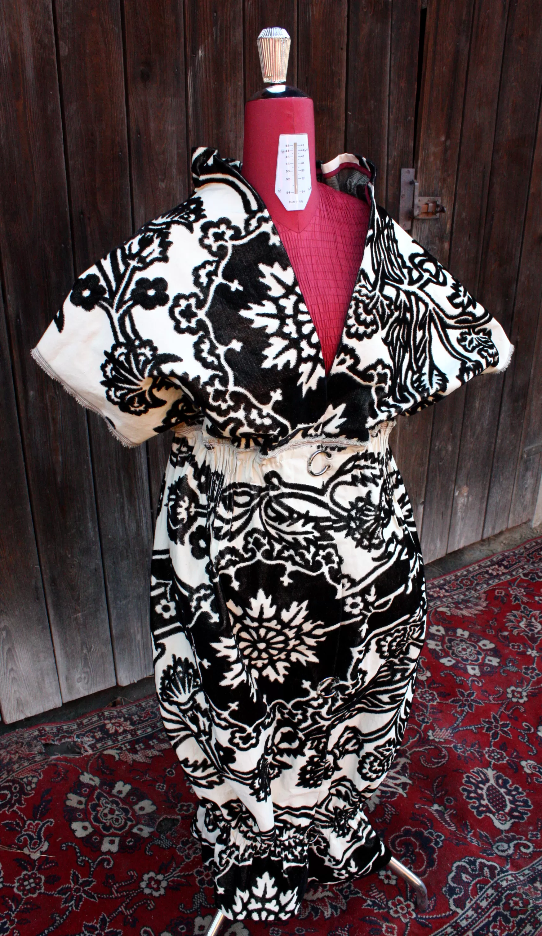 Elegantní, sošná  vesta pro výjimečné příležitosti, Ušitá ze žakáru ručně  tkaného na zakázku v Indii. Začištěna bordó lnem, ze kterého má také vnitřní kapsy. Zapínání třemi kovovými kruhy "zaháknutými" do ručně vyšívaných dírek. Nabírání kolem krku, v pase a pod koleny je pružné.