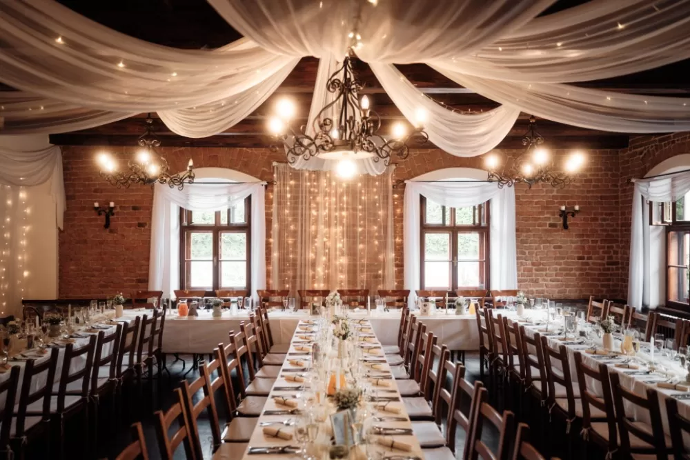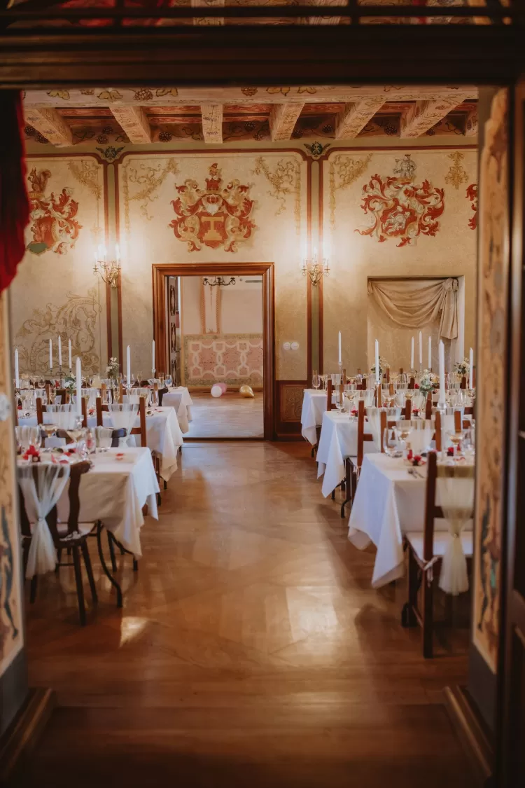 Slavnostní hostina se bude konat v naší zámecké restauraci, která svým autentickým vzhledem přispívá k jedinečné atmosféře celého dne. Restaurace se pyšní historickými zděnými stěnami, které vyzařují kouzlo minulosti, a přitom poskytují moderní komfort. Není to jen obyčejný bílý sál, ale prostor, který dýchá historií a elegancí. Všechny detaily byly pečlivě promyšleny, aby ladily s celkovým duchovním a romantickým prostředím našeho zámeckého resortu. Každý kout restaurace, od rustikálních zdi po jemné dekorace, vytváří harmonický celek, který dodá Vaší svatbě nezapomenutelný nádech historie a výjimečnosti.
